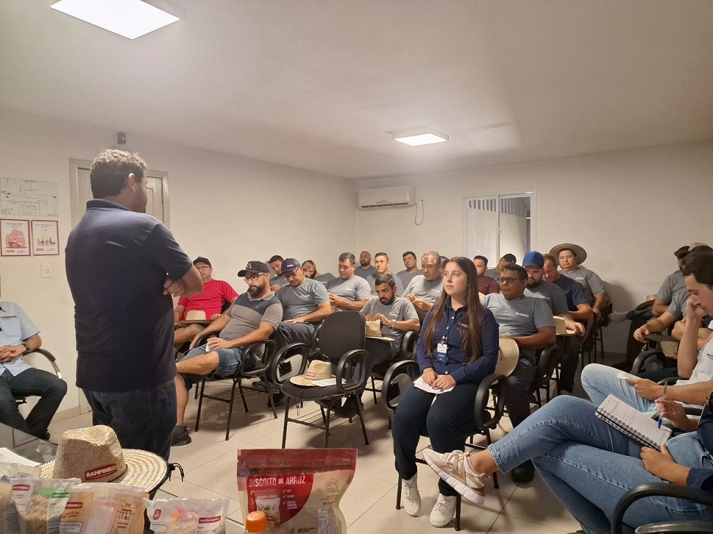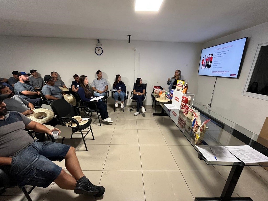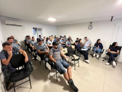 No último dia 13, foi realizada a primeira reunião do ano de 2025 com o setor logística-transporte na matriz da Rampinelli Alimentos. Nesta manhã foi reunida a equipe de logística, todos os motoristas e também o diretor Thiago Rampinelli e o gerente Adalto Spilere.