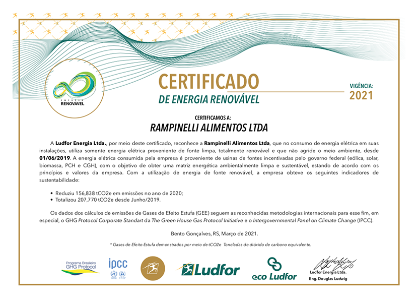 A Rampinelli Alimentos recebeu, por meio de sua filial de Eldorado do Sul, os Certificados de Energia Renovável e Panorama Sustentável 2020, concedido pela Ludfor Energia Ltda. A certificação de Energia Renovável é um reconhecimento do uso de energia elétrica proveniente de fonte limpa, totalmente renovável e que não agride o meio ambiente.