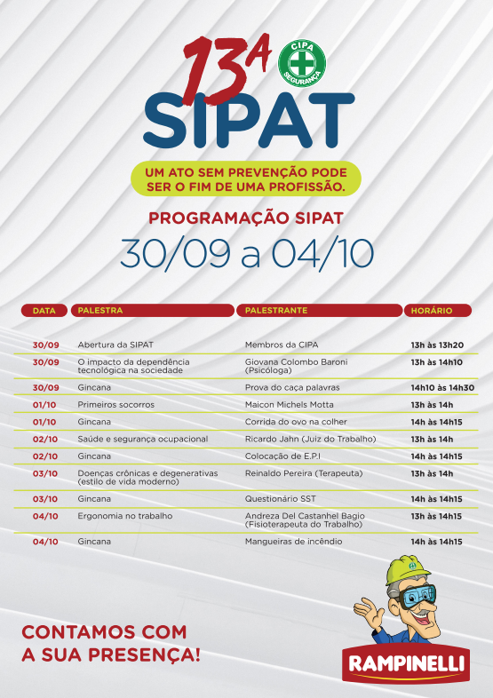 A Semana Interna de Prevenção ao Acidente de Trabalho acontece na matriz da Rampinelli (Forquilhinha/SC) e nas filiais de Caruaru e Eldorado do Sul. O tema deste ano é “Ato sem prevenção pode ser o fim de uma profissão”.