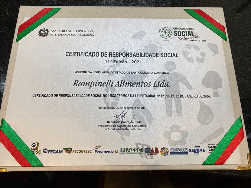 A Assembleia Legislativa de Santa Catarina concedeu o Certificado de Responsabilidade Social de Santa Catarina à Rampinelli Alimentos, com base na Lei 12.918, de 23 de janeiro de 2004. A certificação tem o objetivo de reconhecer e destacar as empresas privadas, empresas públicas e organizações sem fins lucrativos com atuação em território catarinense que tenham a responsabilidade socioambiental incluída em suas políticas de gestão.