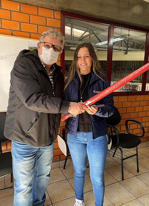 No dia 23 de julho, foi a vez de parabenizar os formandos de 2021. Paula e Willian foram os colaboradores da matriz da Rampinelli que receberam as homenagens. Na cerimônia, ambos ganharam lembranças para marcar a data: um guarda-chuva e uma caneta personalizada.