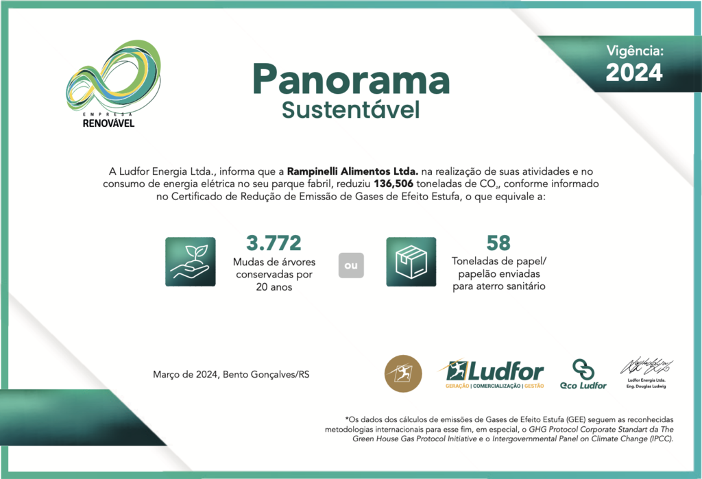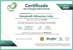 Estamos orgulhosos de anunciar que a Rampinelli Alimentos recebeu o Certificado de Energia Renovável 2024. Este certificado é uma confirmação do nosso compromisso contínuo com a sustentabilidade e o meio ambiente.