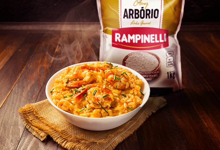 - 02 Depois, acrescente os camarões e cozinhe até que fiquem rosados. Adicione o Arroz Arbório Rampinelli e mexa bem para combinar com os temperos. Despeje o leite de coco e misture.