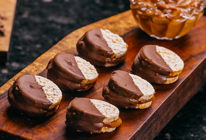 Montagem: Recheie o biscoito de arroz com doce de leite e mergulhe metade em chocolate derretido, espere o chocolate secar para servir.