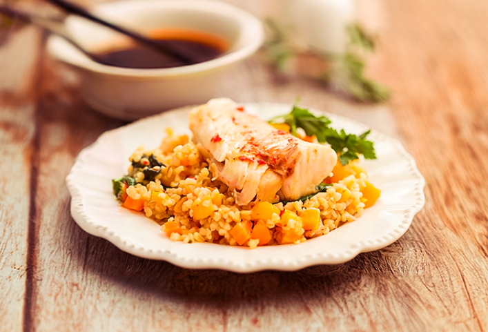 - 03 Misture o bacalhau desfiado e o grão-de-bico ao arroz. Sirva o arroz em pratos individuais, decorando com salsinha fresca picada.
