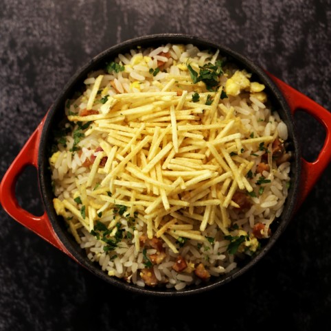 - 08 Depois, misture tudo ao arroz junto com a batata palha e é só servir.