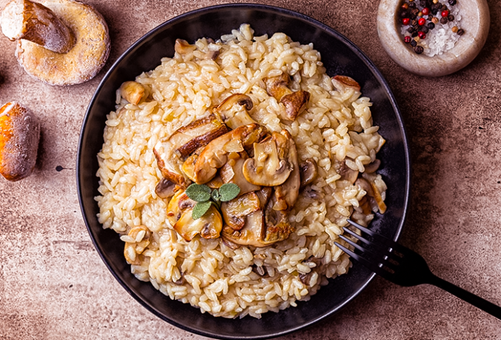 - 02 Acrescente o cogumelo e o Arroz Carnaroli e mexa.