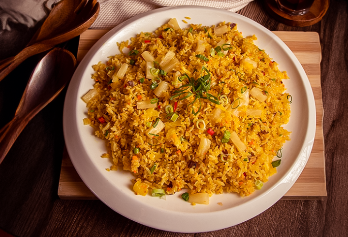 - 03 Adicione o abacaxi em cubos, misture todos os ingredientes do nosso arroz frito e, por fim, cubra com o shoyu. Misture bem para integrar todos os sabores.