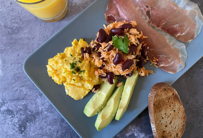 - 01 Na frigideira, jogue um pouco de azeite e refogue o alho e a cebola. Adicione o feijão e deixe fritar. Em seguida, coloque o arroz cozido. Mexa bem os ingredientes. Adicione a Salsa Lizano ou a mistura de caldo de carne e molho inglês. Depois, acrescente o caldo de galinha.