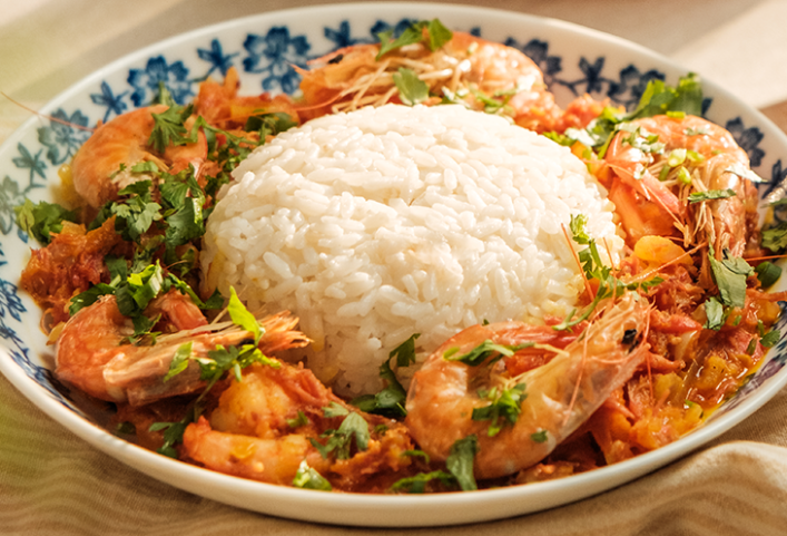 - 04 Coloque o arroz numa forma de bolo untada com óleo e desenforme numa tigela de barro forrada com folha de bananeira. Coloque o camarão moído no centro do arroz e a carne ao redor.