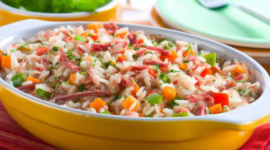 - 01 Na panela de pressão, aqueça o óleo, refogue a cebola, a carne, os pimentões, a cenoura e o Arroz Parboilizado Rampinelli.