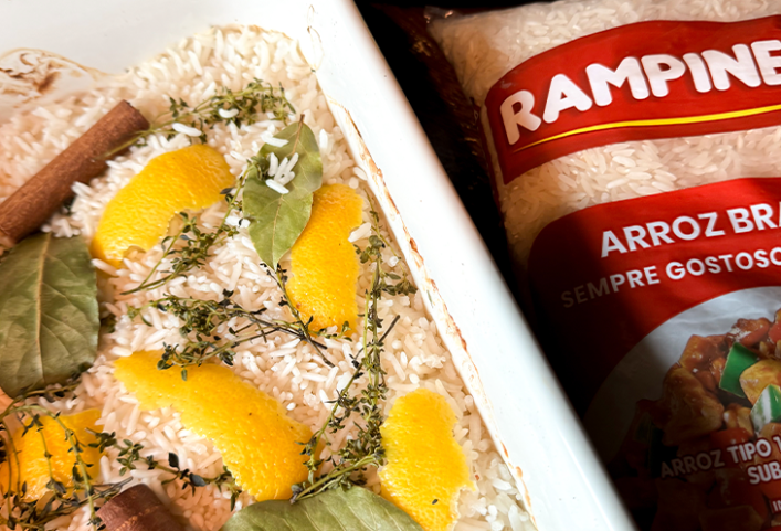 02 Coloque o arroz em uma travessa funda, tempere com sal e coloque a canela, casca de limão, tomilho e louro.