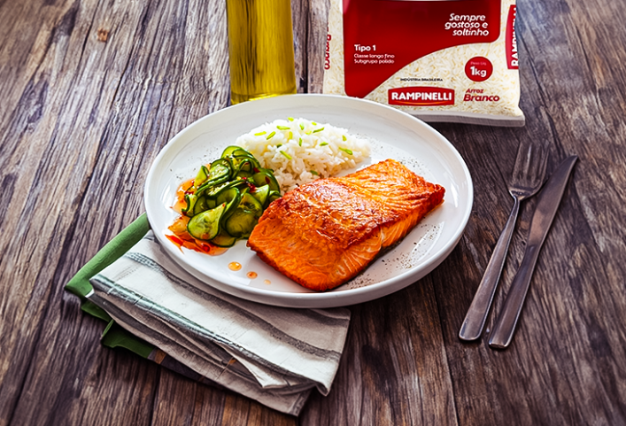 01 Aqueça o óleo em uma panela, adicione o arroz e refogue por alguns minutos. Em seguida, adicione a água e o sal. Deixe ferver, depois abaixe o fogo e tampe a panela.