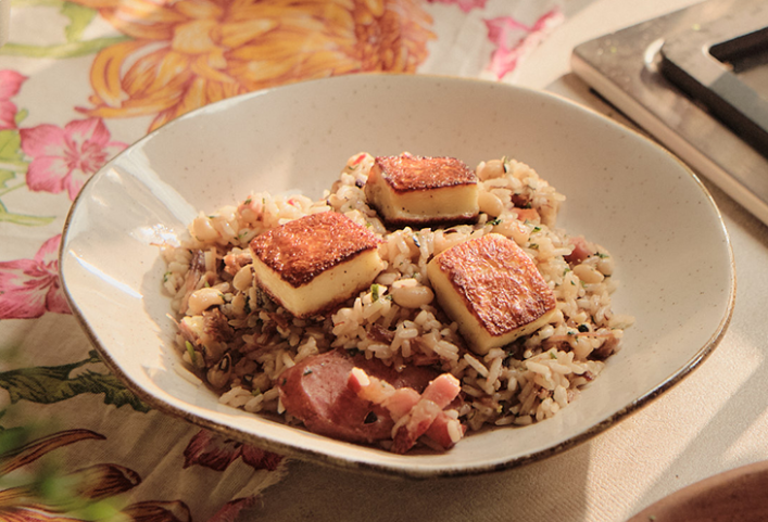 03 Refogue a carne seca desfiada na manteiga de garrafa e cebola e acrescente na panela quando o arroz estiver cozido. Doure o queijo na frigideira e sirva com coentro e cebolinha picados.