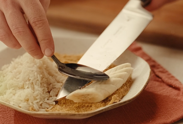 01 Em um liquidificador, coloque a água, a cebola e alho e bata até formar um purê e reserve. Em uma tigela, junte a carne, o tempero do liquidificador, o sal, cominho, páprica e as folhas de louro e misture bem. Deixe a carne marinando por pelo menos 8 horas. Forre o fundo da panela de barro com as fatias de bacon e depois coloque a carne em cubos, com os temperos. Feche a panela com uma tampa, lacre esta tampa com uma mistura de farinha de mandioca e água e leve ao fogo médio por 8 a 10 horas. Depois deste tempo, abra a tampa com cuidado e monte o prato. Coloque farinha de mandioca e o caldo do cozimento do barreado. Misture com uma colher até formar um pirão grosso. Coloque os cubos de carne e a banana fatiada. Prepare o Arroz com 2 dentes de alho refogados em 1 c de azeite, acrescente o arroz e água conforme instruções da embalagem.