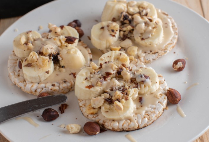 Receita de Biscoito de arroz com creme de amêndoas, banana e avelã