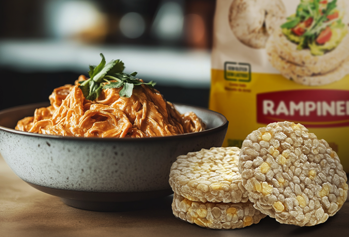 Receita de Biscoito de Arroz Integral com Milho com Frango Desfiado ao Curry com Amendoim