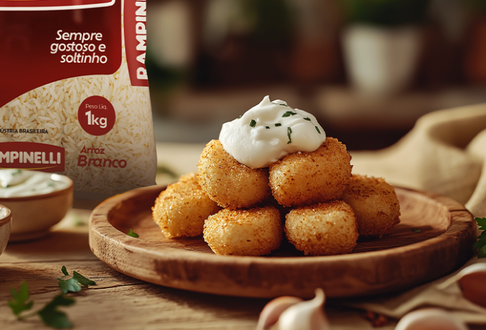 - 01 Em uma tigela, misture o Arroz Branco Rampinelli, o bacalhau desfiado, a farinha, o ovo e os temperos até formar uma massa homogênea.
