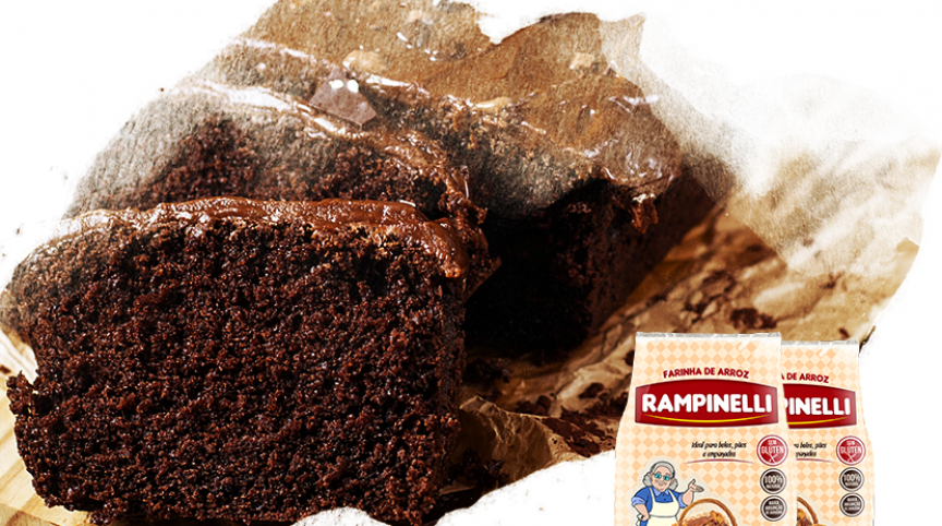 - 01 Bata os ovos com o açúcar, o óleo e o chocolate. Junte a água morna, a farinha de arroz Rampinelli e o fermento, bata até a mistura ficar homogênea. Derrame a mistura em forma redonda com furo central de aproximadamente 20 cm untada a óleo. Leve ao forno pré-aquecido a 180ºC por 15 minutos, reduza para 120ºC e deixe assar por mais 15 minutos.