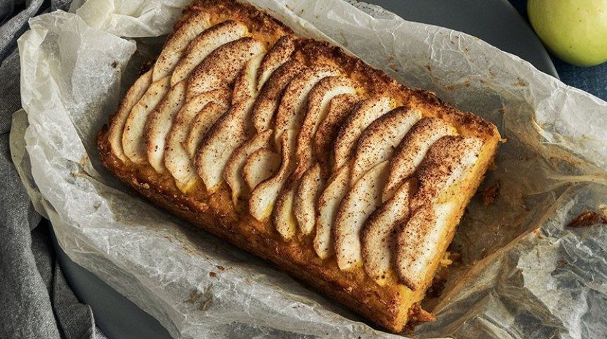 - 02 Adicione as maçãs descascadas e cortadas em pedaços bem pequenos. Coloque numa forma retangular untada ou forrada com papel manteiga.