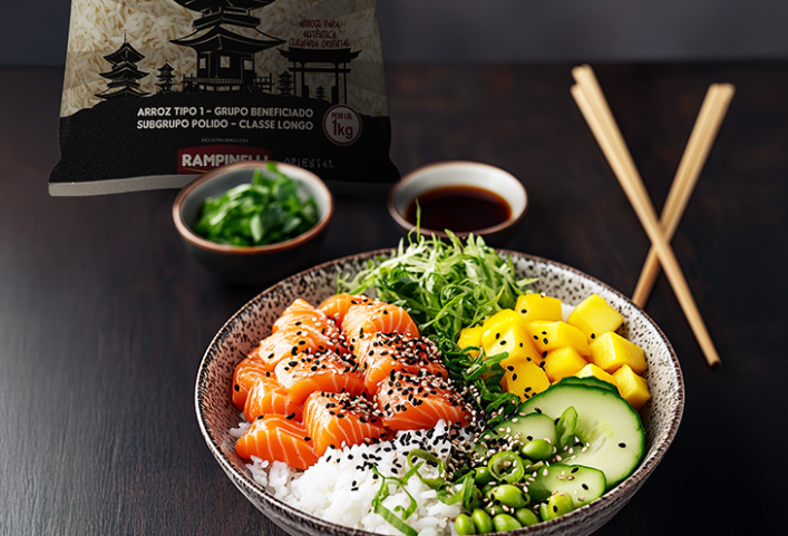 - 02 Em uma tigela, monte seu poke: use o arroz como base e adicione salmão, edamame, manga e pepino.