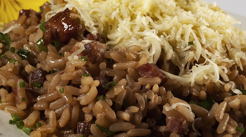- 04 Acrescente o arroz e cubra com água. Temperar com sal e pimenta do reino, e tampar a panela.