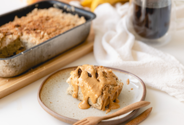 - 08 Despeje por cima da massa e da banana e leve ao forno para assar por 180º por cerca de 40 minutos ou até ficar dourado