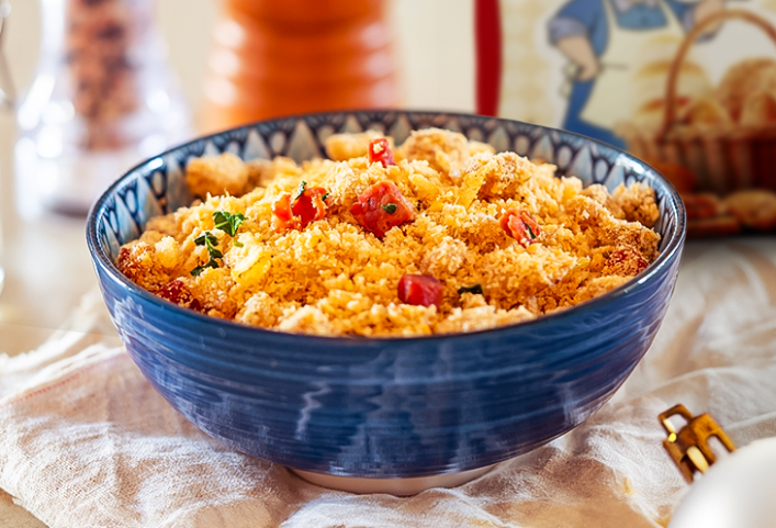 - 08 Transfira a farofa para uma travessa de servir e decore com alguns ingredientes extras, como nozes ou damascos, se desejar.