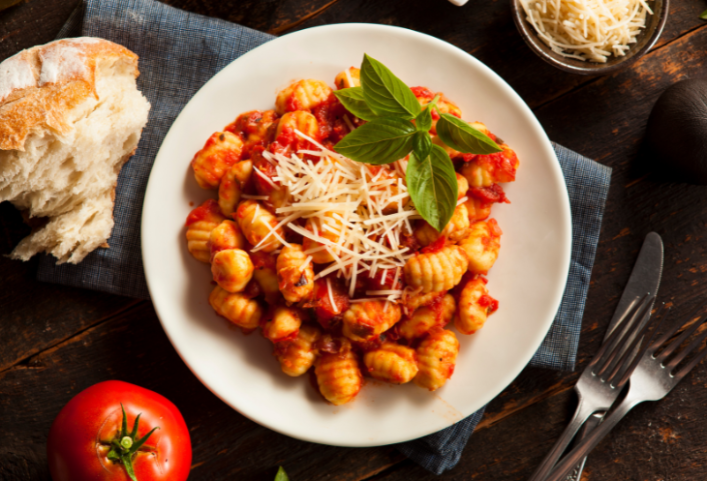 - 07 Leve ao fogo uma panela média, com água temperada com sal e folhas de manjericão. Quando a água levantar fervura, vá colocando os nhoques, até eles começarem a subir. (A água deve ir até o meio da panela).