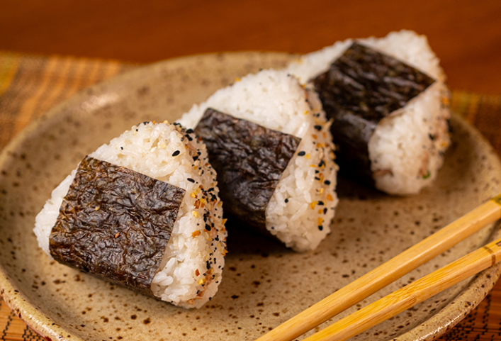 - 05 Envolva cada onigiri com uma tira de nori e finalize salpicando gergelim torrado por cima.