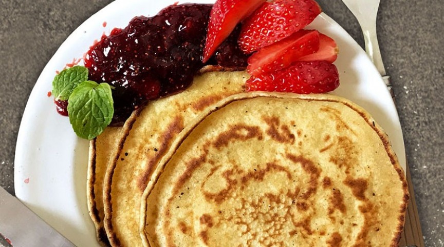 - 03 Derreta um pouco de manteiga numa frigideira em fogo médio. Acrescente uma concha da massa da panqueca e deixe fritar até a massa borbulhar. Vire a panqueca ao contrário para cozinhar do outro lado também. Conte 1 ou 2 minutos e retire para um prato com papel absorvente. Repita com a massa restante, untando a frigideira de novo se precisar.