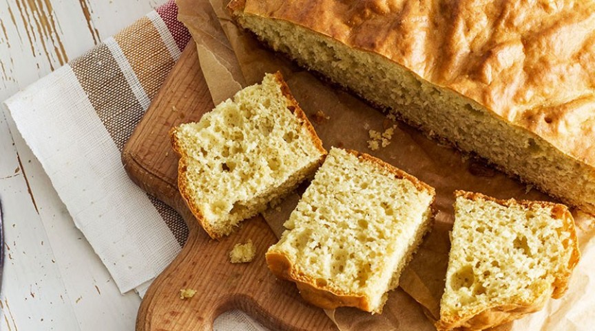 - 05 Transfira a massa do pão sem glúten para uma assadeira untada e enfarinhada com farinha de arroz, e leve a assar no forno preaquecido a 200ºC por 30-40 minutos, ou até dourar.