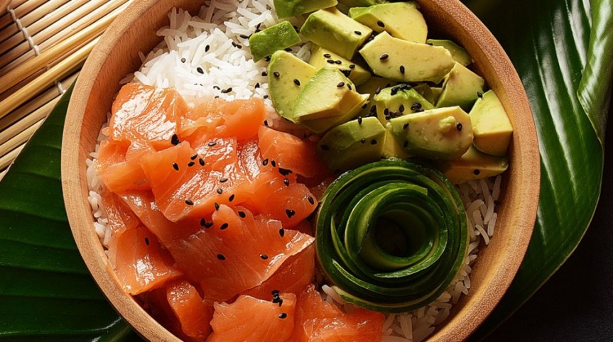 07 Coloque o arroz ao fundo. Disponha lateralmente o sunomono, o ovo cortado ao meio, as tiras de nori, meio avocado e um pouco da cebola roxa.