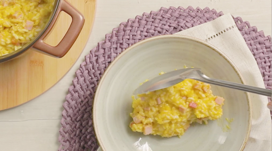 - 03 Acrescente o arroz Arbório Rampinelli e refogue por alguns minutos. Adicione o vinho branco e deixe evaporar em fogo alto.