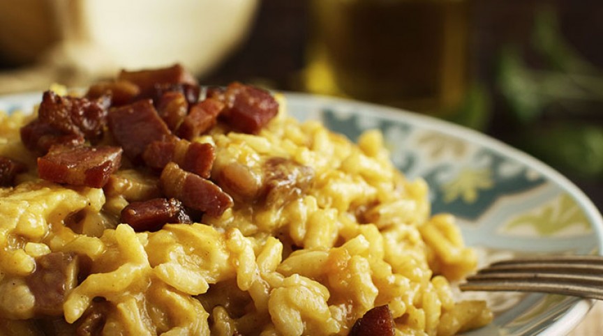 - 04 Na última xícara de caldo, acrescente a abóbora. Como ela estará cozida, vai desmanchar no arroz nessa reta final.