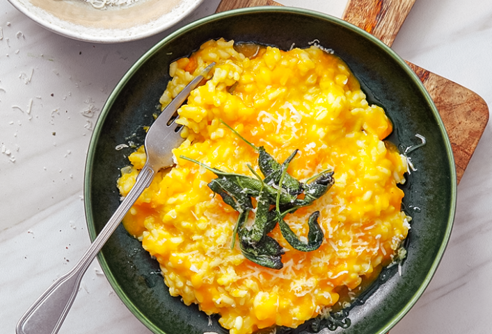 - 03 Depois, acrescente gengibre, folha de louro e o Arroz Arbório. Misture.