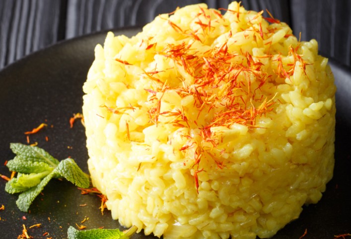 - 09 Na última mexida, coloque o açafrão dissolvido na água e misture até que o arroz fique todo amarelo.
