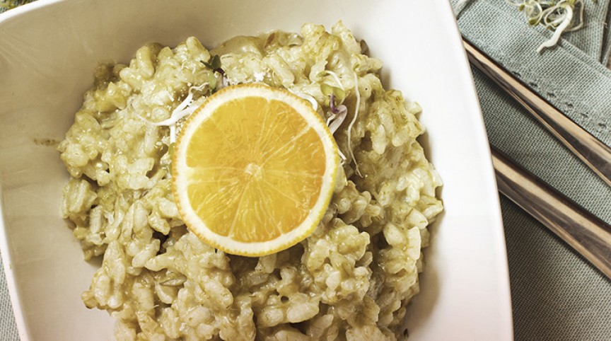 - 05 Logo após a última concha de caldo ser adicionada, adicione as raspas de limão, o alecrim picado e o suco de limão. Mexa tudo por 2 minutos.