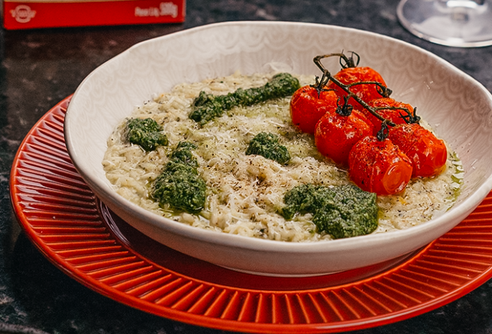 - 13 Acrescente a manteiga e o pesto no risoto já pronto. Então é só servir com os tomates já confitados.