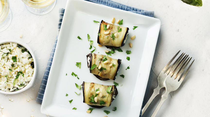 - 06 Ligue o forno para aquecer. Forme 12 bolotas de arroz e enrole cada uma em uma fatia de berinjela. Acomode-as em um refratário untado com azeite e leve para o forno, pré-aquecido, para gratinar.
