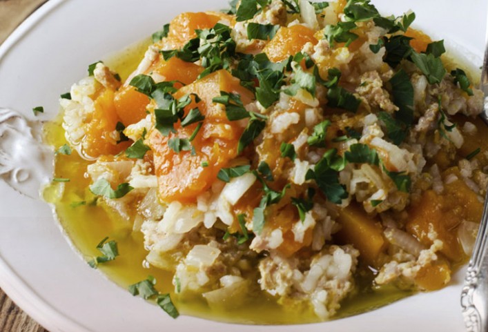 - 04 Acrescente os fragmentos de arroz, coloque sal a gosto e deixe cozinhar com tampa até a abóbora e a batata estarem cozidas.