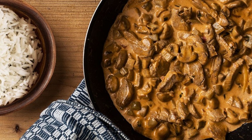 - 03 Na mesma panela do refogado, aqueça um fio de azeite e sele as tiras de carne até que fiquem bem douradas de todos os lados, por aproximadamente 3 minutos. Então, coloque o refogado de cebola e cogumelos reservado junto à carne.