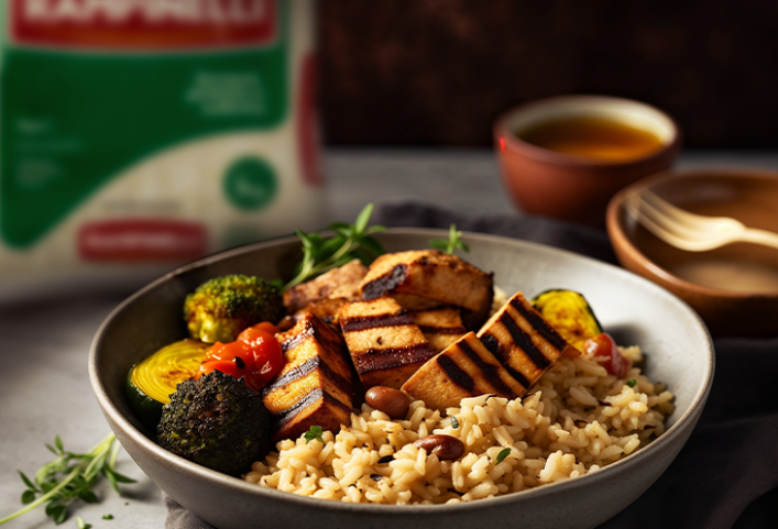 - 05 Monte as tigelas adicionando os legumes assados e o tofu grelhado por cima do arroz.