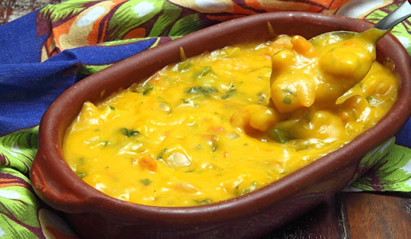 - 04 Em uma panela, coloque o dendê, o urucum ou colorau, o caldo reservado, os camarões e misture.