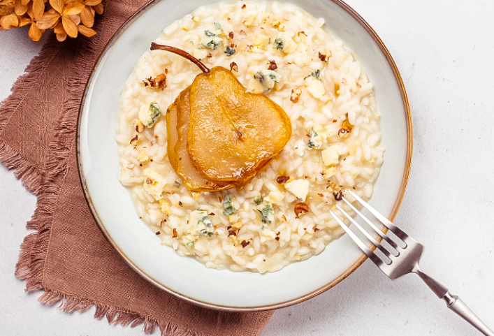 - 01 Refogue a cebola e o alho na manteiga e, em seguida, adicione o Arroz Pérola Rampinelli e o vinho. Depois, acrescente o caldo de frango aos poucos até o arroz ficar al dente. Incorpore o gorgonzola e o parmesão, mexa até derreter e ficar cremoso. Sirva quente.
